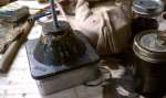 The glue is generally used near one of the main machines in a shoe repair shop, the big and noisy grinder/finisher. This is where soles are heals are first sanded down and then finished and where all shoes are polished. We had a policy at Tip Top that every shoe got at least a quick polish when it came in for repair, even it is was just a small sewing job. People really noticed it and appreciated it. I polished A LOT of shoes.