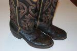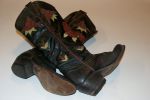 After I had been with Dave for a few months and had been doing many of the repairs on the uppers and some heals (he did the soles), Dave asked if I wanted to make a pair of boots! Imagine the excitement!! The first pair that I made (shown above on the left) were actually pretty nice and clean, but they didn’t fit. I could pull them on and even walk around a bit, but my poor toes were crushed. However, I did really enjoy it. The next pair was for Katherine, and I got fancy to the point of gaudiness, with fancy rose inlays. They took a long time and were not bad. They even fit her, and she wore them a lot for a while. Now, she’s not a big cowboy boot sort of gal… My third pair was more of a solo effort and was an attempt to get something that fit me better. They were pretty big, but over the years they have fit better and better for me. I use them when I demonstrate leatherwork at Morningside Nature Park now. But they are really ugly!