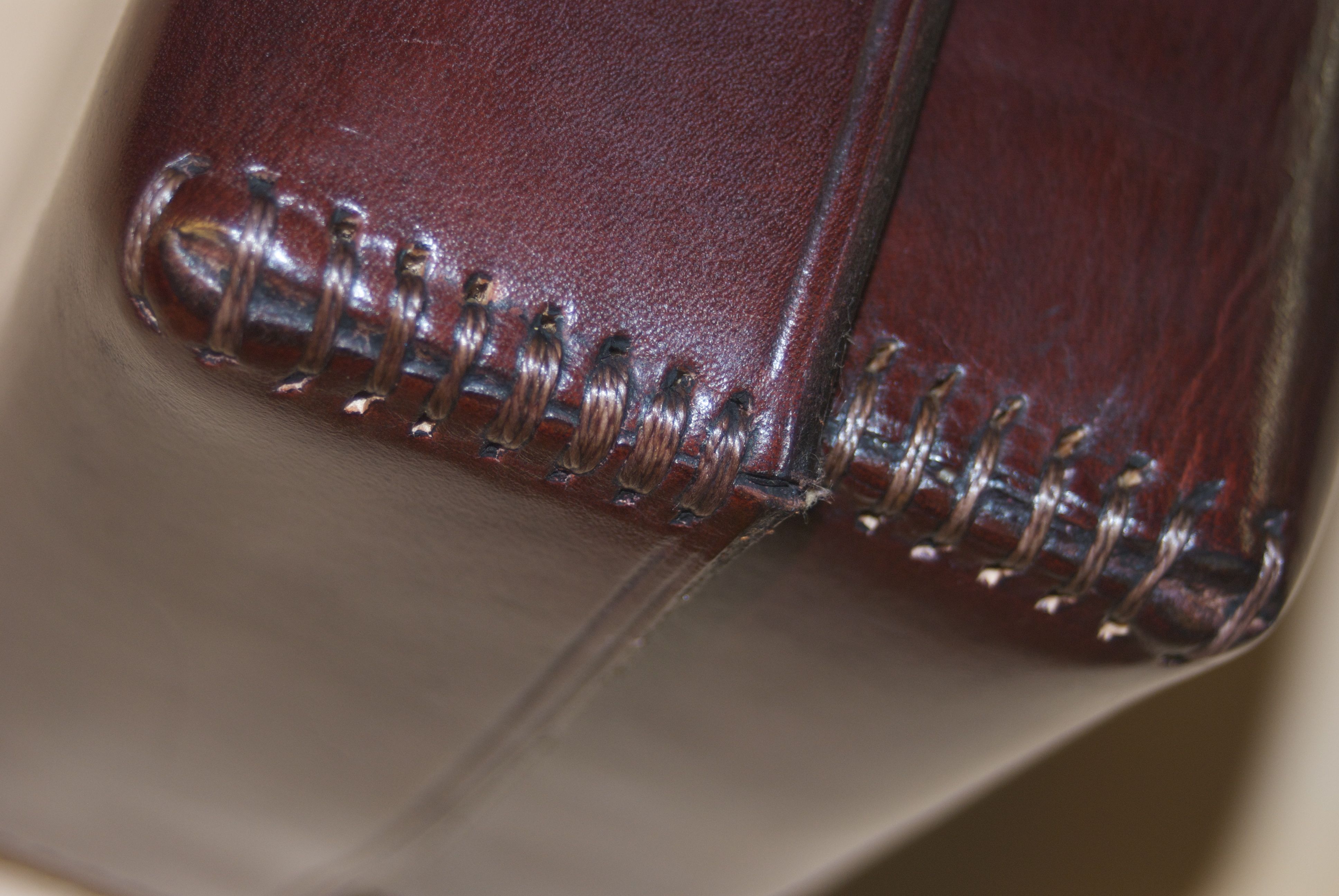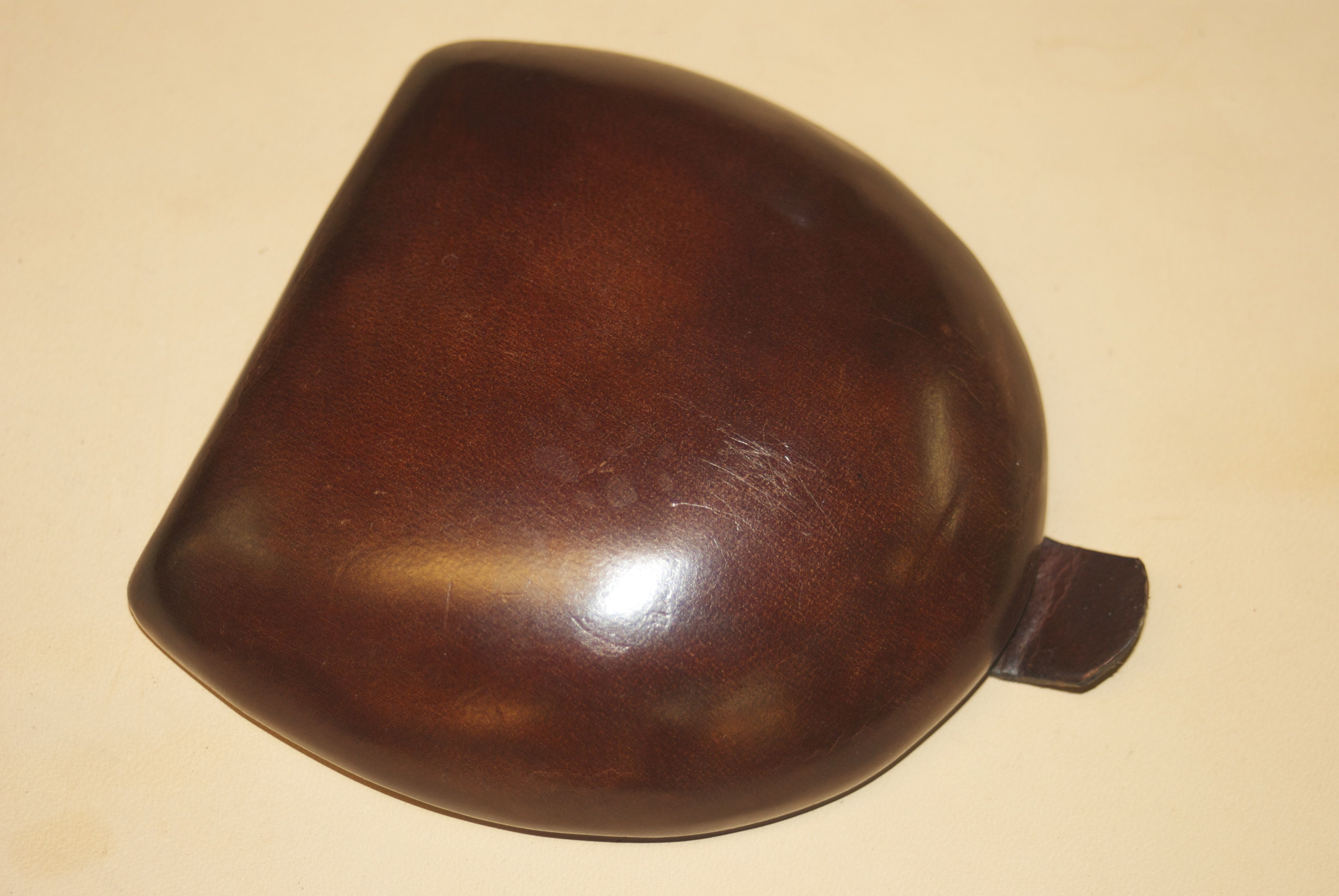 I bought a wonderful coin purse from him. The work really caught my eye because of the formed leather and finish. I asked him about the finish, and he explained to me that it was rubbed leather with standard dye. I’ve done a lot of molded pieces in my life but nothing that looked quite like this.