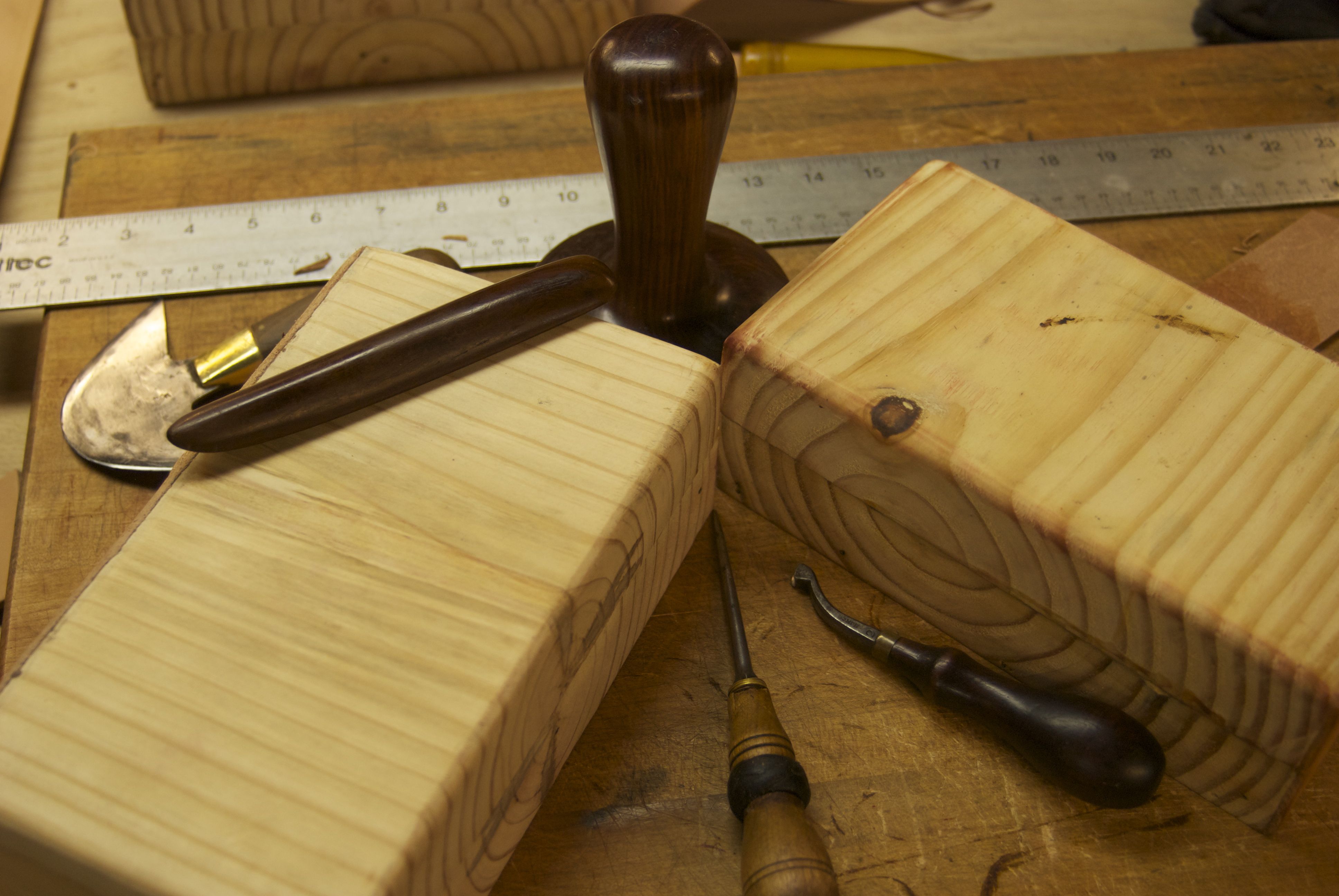 As I mentioned in a recent blog, I’ve been working a lot lately on leather boxes. One of the keys to my new design is fairly intense rubbing and forming over wooden blocks that are cut to the right sizes. I realized that this would be a nice chance to explore the sort of finish that I found in Italy. I’m very happy with the result and really owe a debt of gratitude to the wonderful craftsman in Florence who shared his knowledge with me.