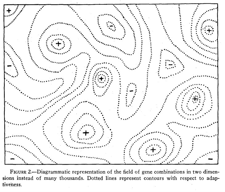 When we are pushing rocks up hills, we tend to not see alternate paths off to the side that may not seem direct but ultimately may be a lot easier. My mental image is Sewall Wright’s adaptive landscape that provides an abstract way to think about how mutations in populations of interbreeding species can lead to adaptation and evolution.