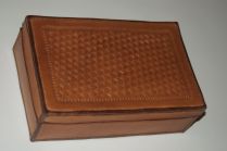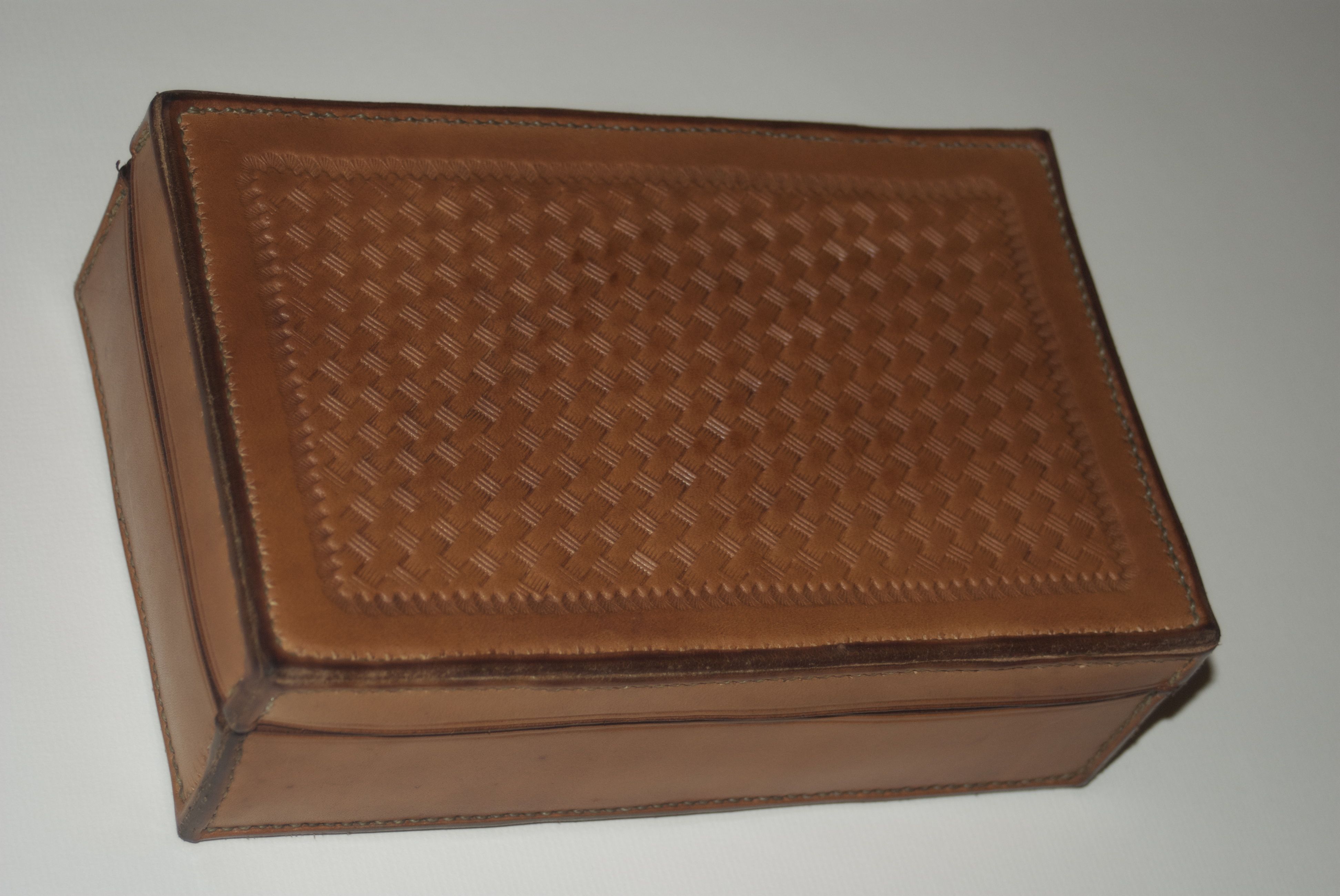 Leather box with mitered and hand-sewn edges.