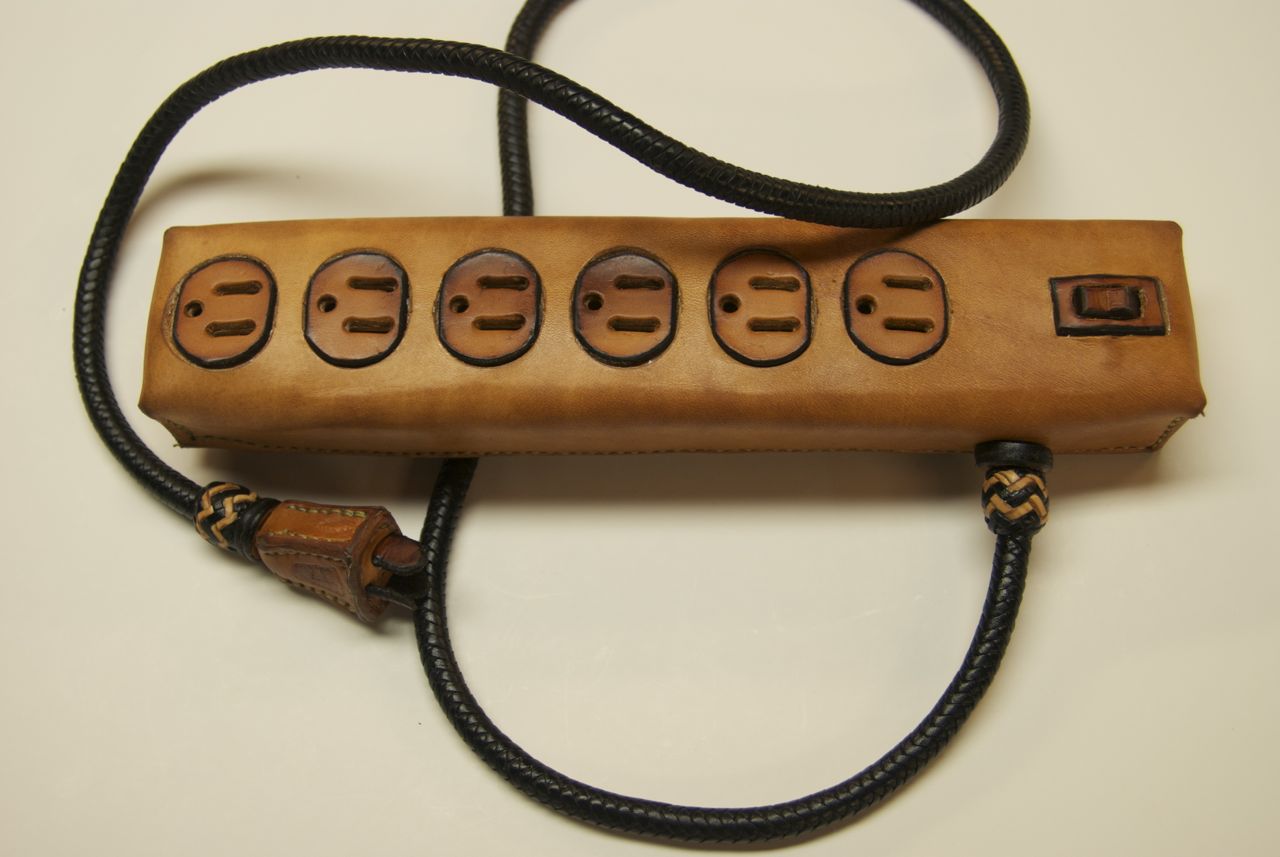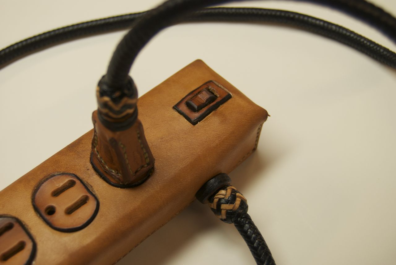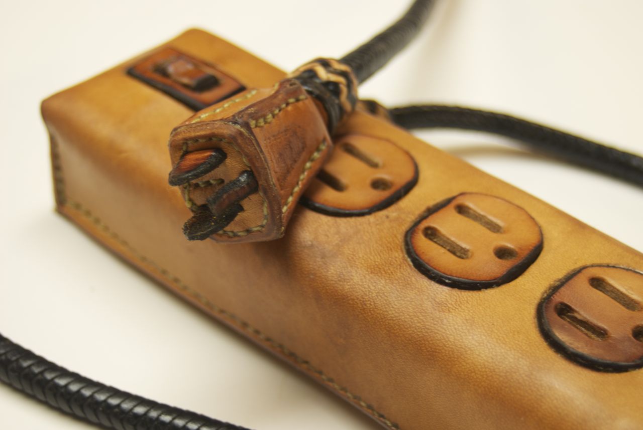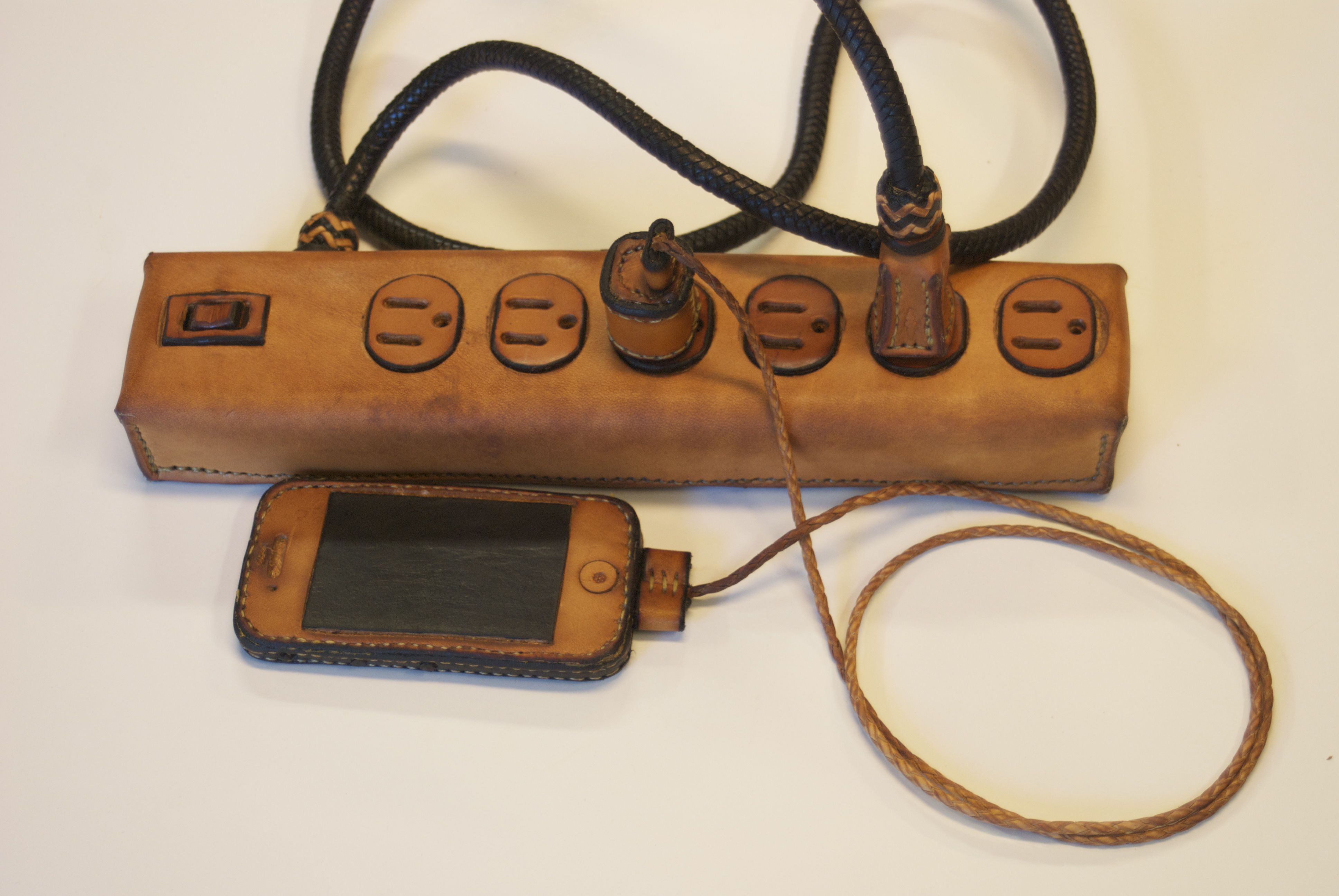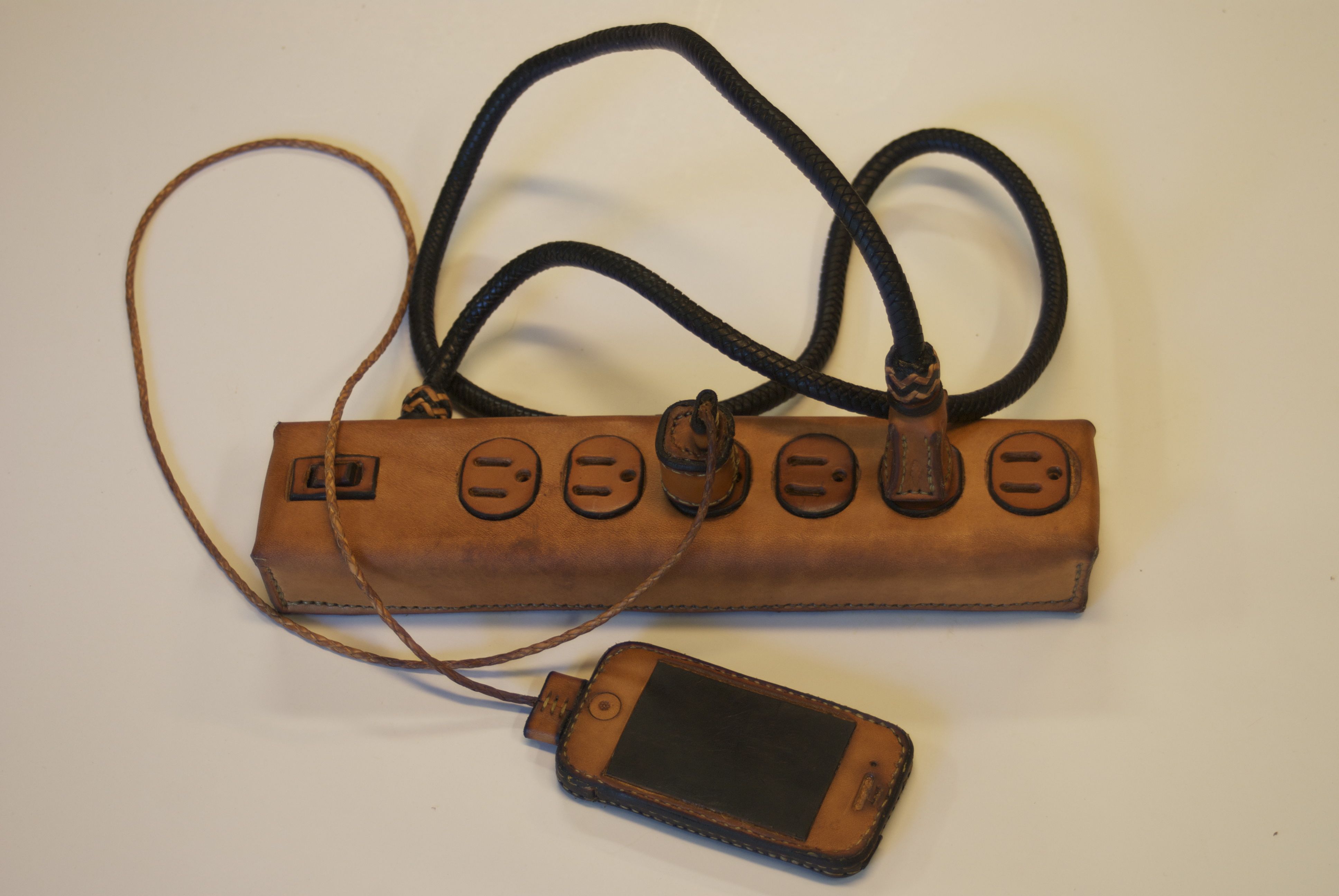 All of our electronic gadgets need charging, and with the proliferation of devices, ugly power strips and cords are all over most houses. The random and cluttered cords are so ugly and yet so representative of our modern lives. These extremely practical devices are all mass produced and are cluttering our landfills with nasty materials, because we need to update them every few years. This series puts the spotlight on this clutter with items that are all hand made, hand stitched, and braided using traditional saddle making techniques that have been around for centuries.