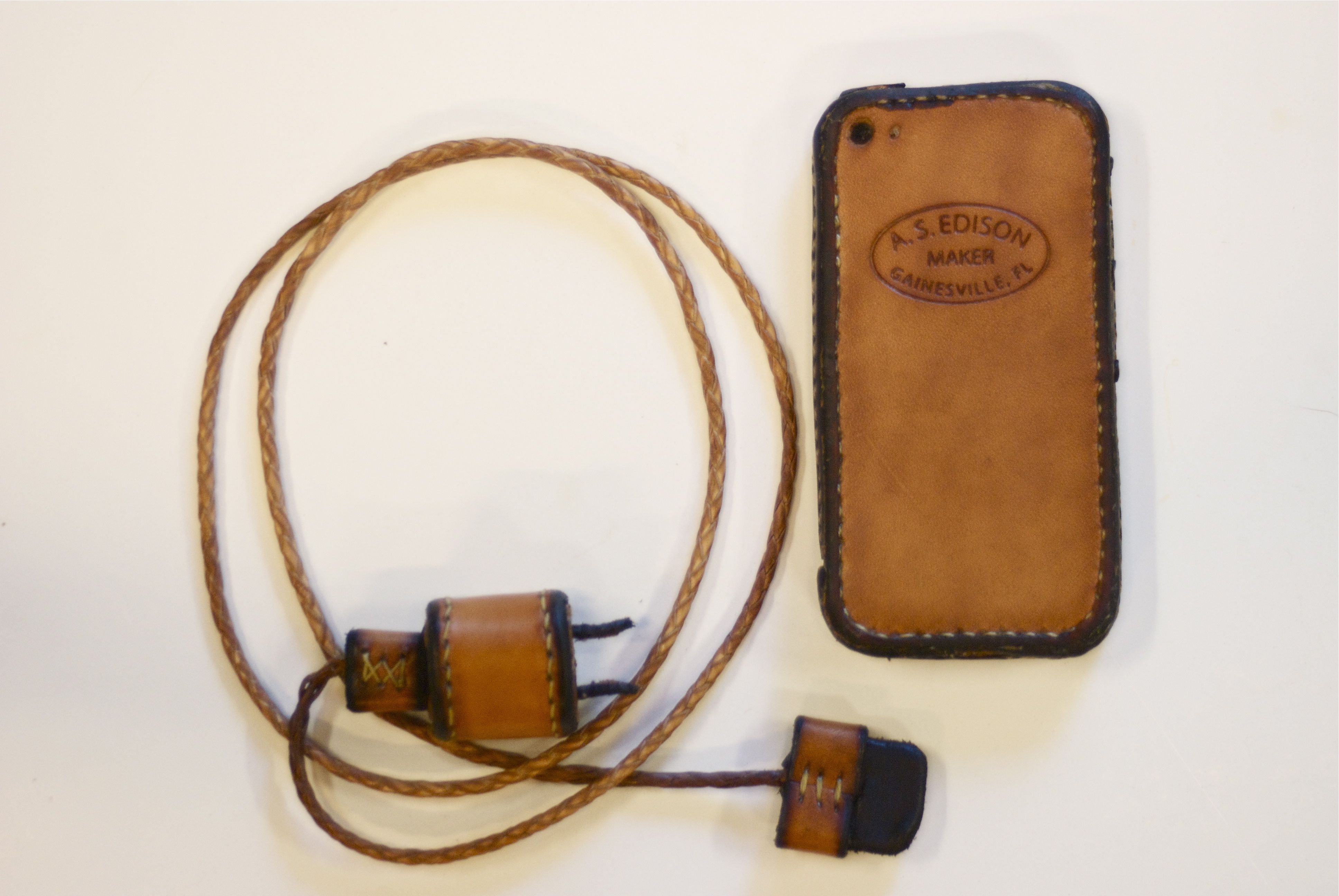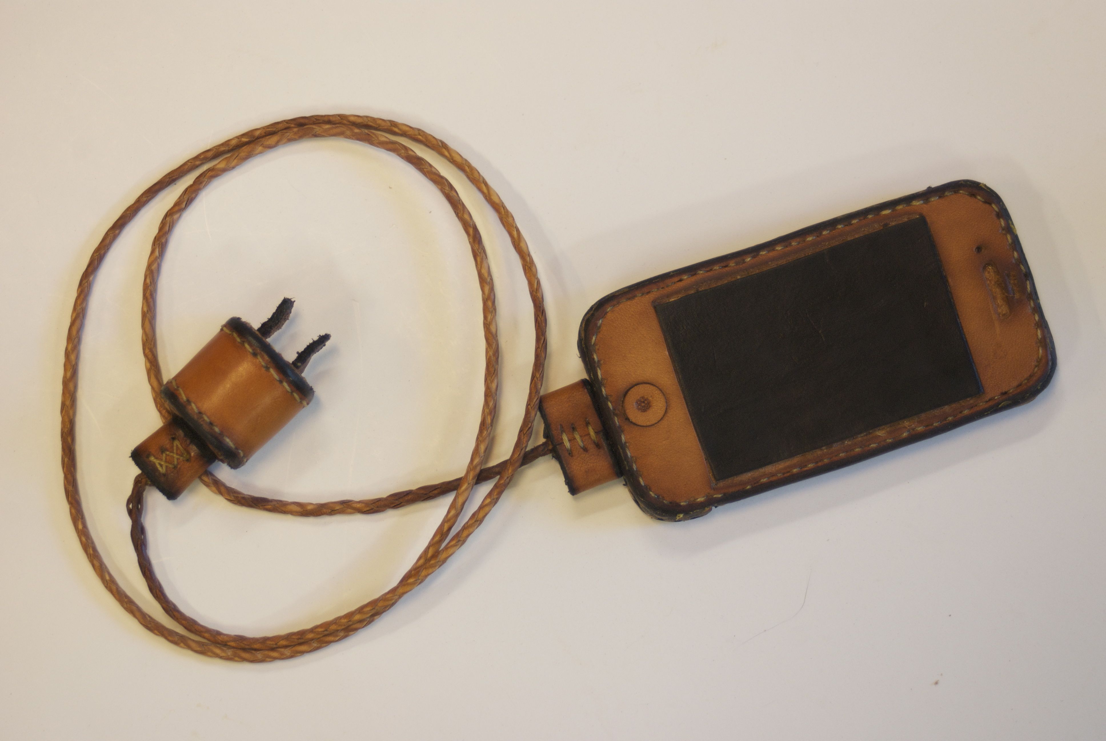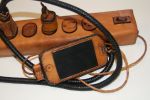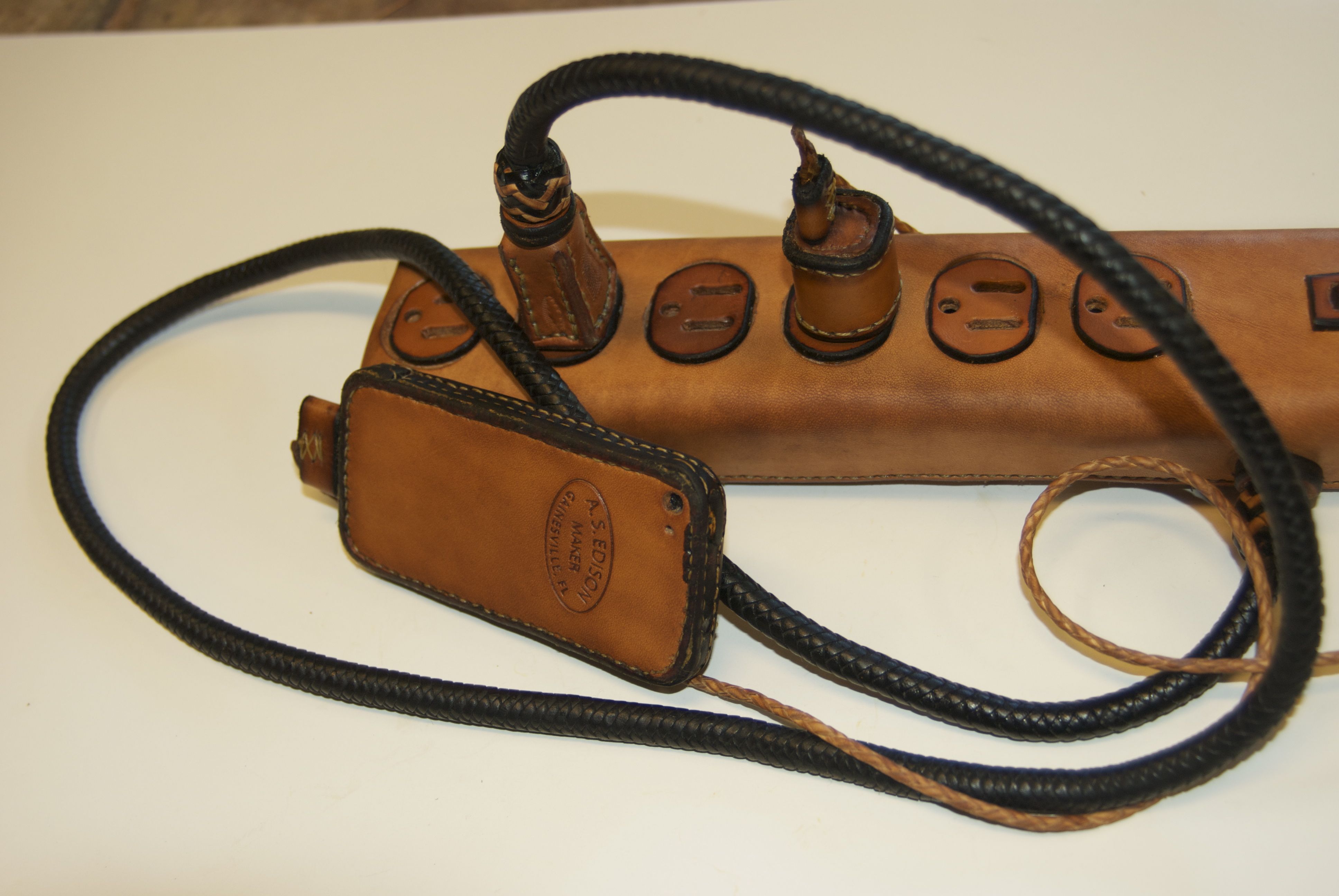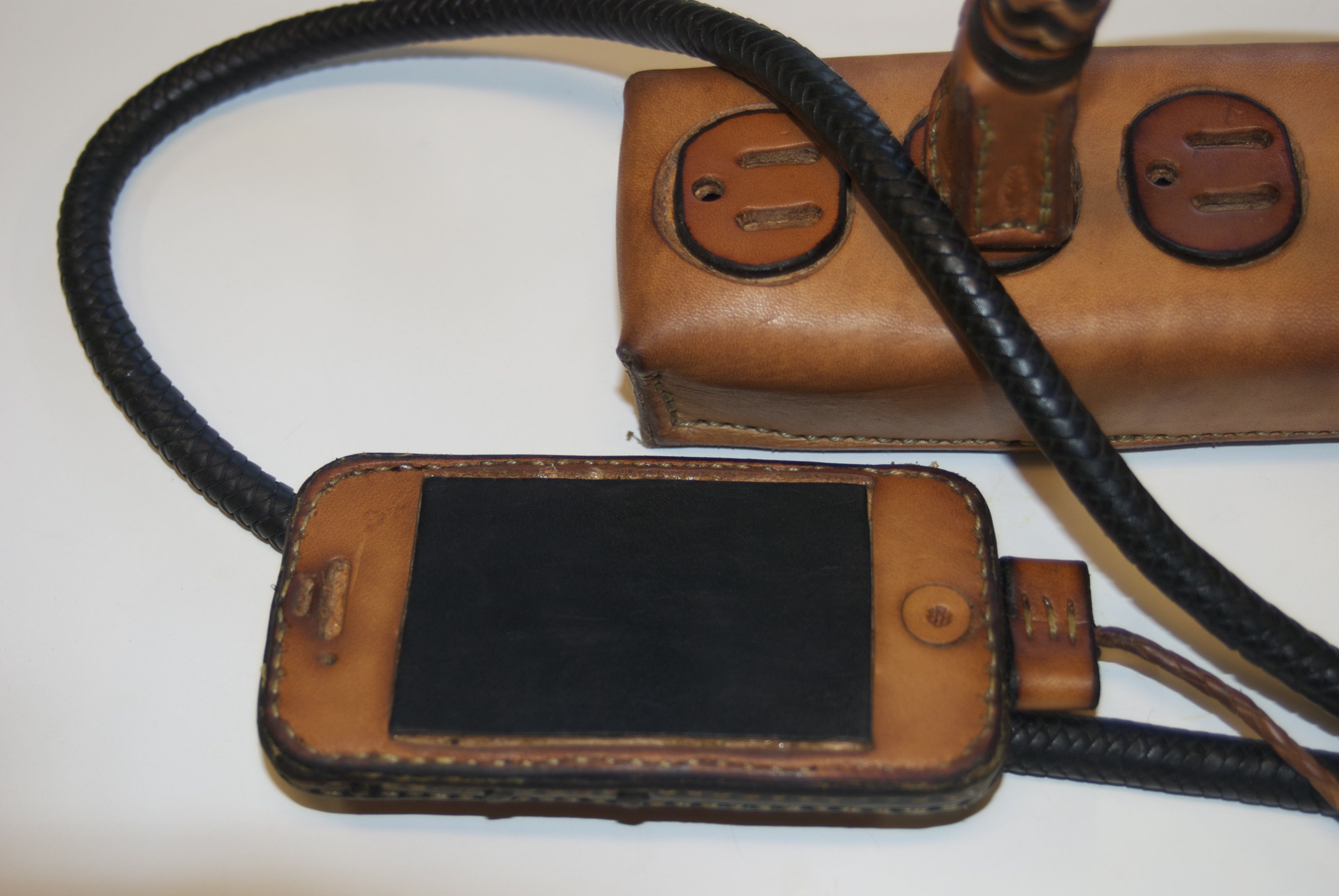 All of our electronic gadgets need charging, and with the proliferation of devices, ugly power strips and cords are all over most houses. The random and cluttered cords are so ugly and yet so representative of our modern lives. These extremely practical devices are all mass produced and are cluttering our landfills with nasty materials, because we need to update them every few years. This series puts the spotlight on this clutter with items that are all hand made, hand stitched, and braided using traditional saddle making techniques that have been around for centuries.